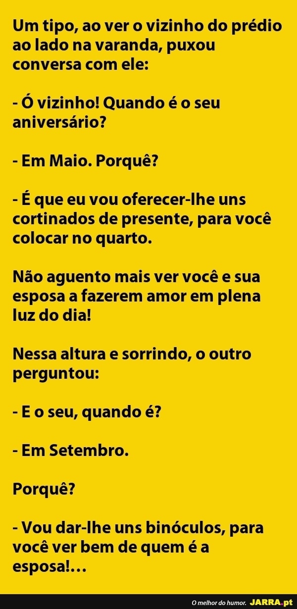 Um tipo, ao ver o vizinho do prédio ao lado na varanda...